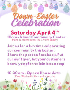 The Easter Bunny will be at the Island Community Center beginning at 10:00 and Opera House Arts will be hosting holiday crafts and a movie. Be sure to stop by the other participating locations to extend your holiday fun. The Island AgencyEstate, Camden National, Boyce’s Motel, Opera House Arts at the Stonington Opera House